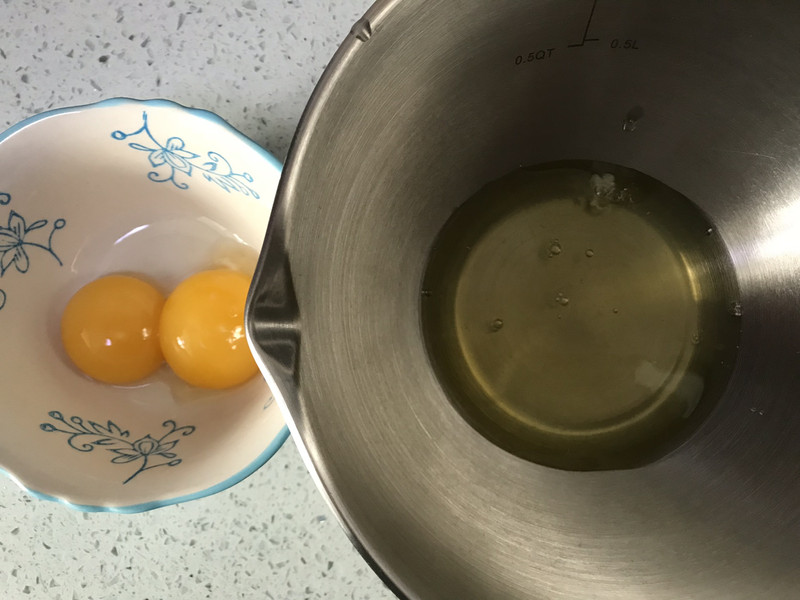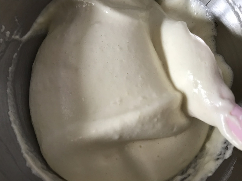 2、加入面粉以后不要过度翻拌,拌到没有干粉即可,多少有些颗粒没关系,是没法拌匀的,拌的时间久了面糊会越发的消泡厉害。