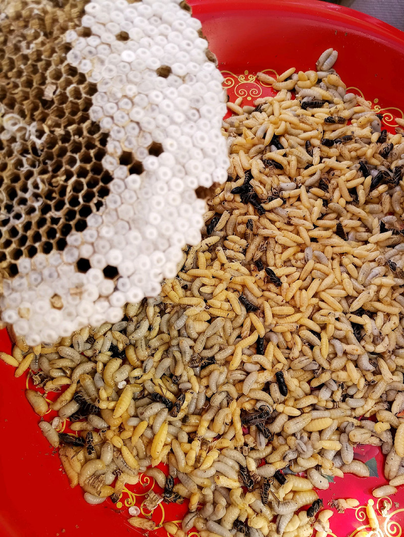 油炸蜂蛹这道菜似乎是大自然对少数民族的恩赐,做法很简单,越是简单越是美味,不过食材很难遇到,和地域、季节有关。