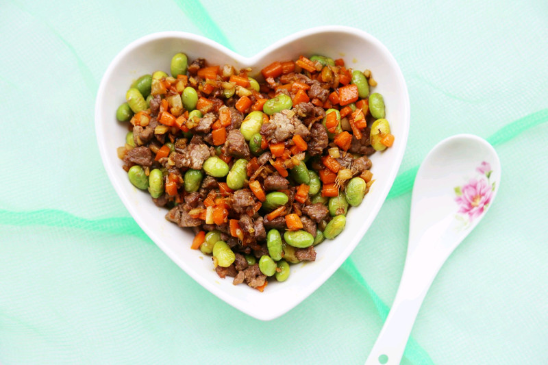 牛肉属于红肉,营养价值比猪肉高,牛肉蛋白质含量高,而脂肪含量低。具有补脾胃、益气血、强筋骨、消水肿等功效。以前经常做土豆烧牛肉,没有一点新意,经常吃也会腻,今天来一道毛豆炒牛肉,牛肉切成丁状,和新鲜的毛豆一起,再加上胡萝卜,色彩鲜艳,荤素搭配,营养丰富,超级下饭,做法也简单,小朋友也可以吃哦。