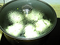 蒸好后熄火,不马上揭盖,继续焖5分钟左右,以防出锅时塌陷。