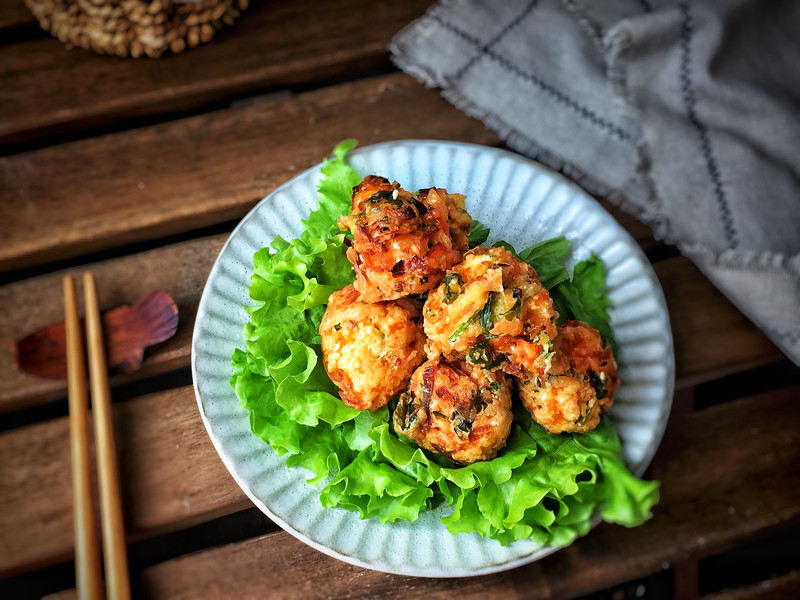 3、面粉的用量不要放太多,如果干粉类太多,导致面糊过稠的话,做出来的丸子会很硬,有嚼劲。但是也不要太稀,炸出来的丸子会不成型。