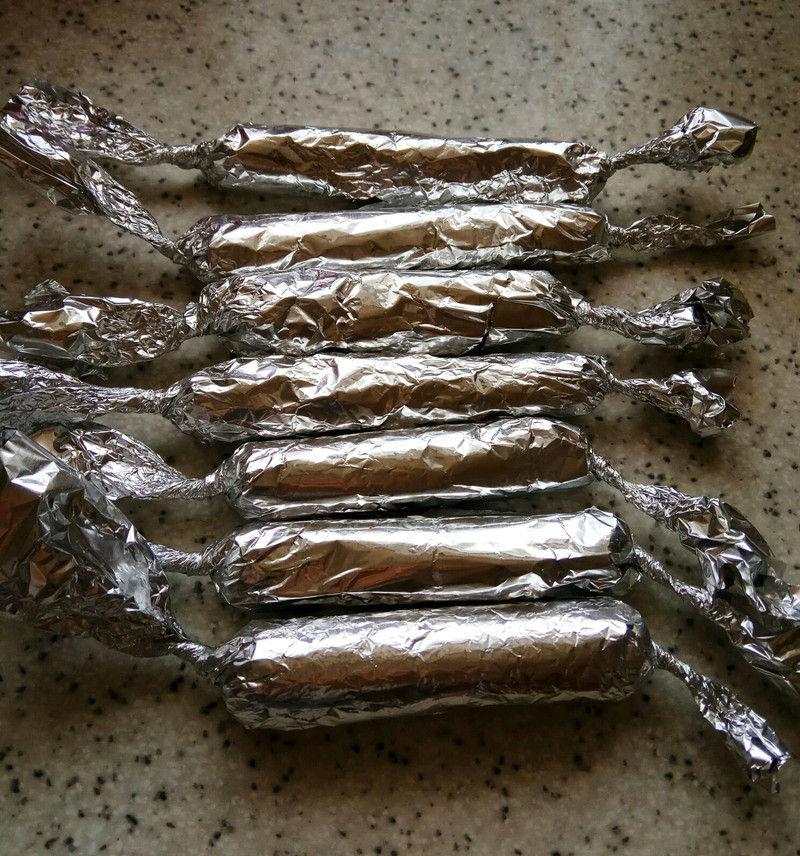 由于孩子最近咳嗽所以没有添加海鲜类,可以适当的添加虾皮、扇贝柱、鱿鱼、墨鱼,玉米粒等味道会更鲜美。用锡纸包的时候尽量捏紧实,这样香肠蒸好后脱模的时候才不会散。加柠檬汁是为了提味和延长保质期,如果不喜欢的话可以省略。
