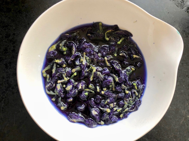 1. 注意一定要用开水,对,是开水泡开蝶豆花,而且要完全晾凉才能倒入厨师机桶内,不然里面的酵母就要被烫死咯!