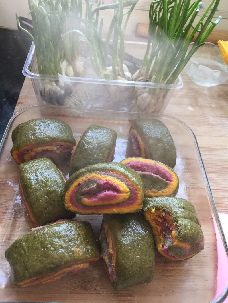 这个面粉和蔬果比例我都是凭感觉做出来的,毕竟做的多了眼睛就是称了。所以具体的比例我建议大家可以一次性加够果蔬,在依次逐渐加入面粉。我做的这款彩虹馒头每一个面团里我都加入了适量的粗粮以及玉米粉,你也可以放牛奶、或鸡蛋!蒸馒头冷水下锅,可以二次发酵