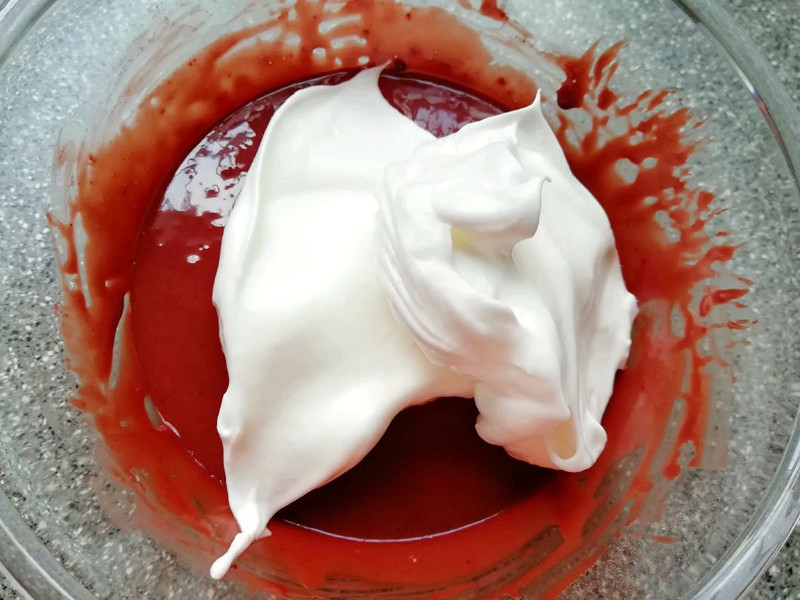筛入混合好的低筋面粉和红曲粉,用手动打蛋器呈“Z”字形来回搅动,切记不要转圈搅拌,以免起筋。