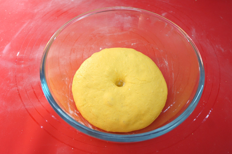 面团成型后用手摸一摸,如果太硬就再加一点南瓜糊继续揉;揉好的面团柔软而且滋润,摸起来像脸蛋那样有弹性,可以放在面包桶中盖块湿布选择发酵程序,也可以取出放在盆里,蒙块保鲜膜,放在温暖湿润处进行基础发酵;我是大蒸锅里放水烧热,然后关火,把面盆放进去,有一个小时就能发好;