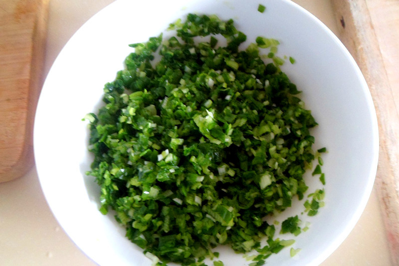 5:事先在锅中烧热些热油浇在馅里,增加口感。