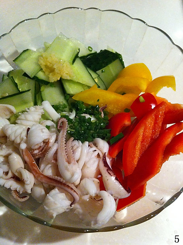 首次尝试将白灼后的鲜鱿鱼和彩椒再加上点青瓜来个大杂烩,按自己的想象调味拌起来,想不到味道还挺好,而且视觉效果极佳,颜色艳丽又不失清爽,又多了一道菜。也许是因为彩椒含有大量的VC,我这没吃药的人,第二天感冒居然好了很多,看来我不吃药多不出VC抗热感的决定是多么英明!
