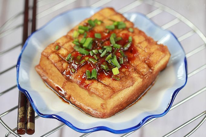 2.在豆腐表面划刀可以让豆腐更加入味,今天加了老抽来上色,生抽来调节味道,同时白糖可以提升这道豆腐的味道,让豆腐更加鲜美,所以今天的汤水其实全被吸到豆腐里面去了;