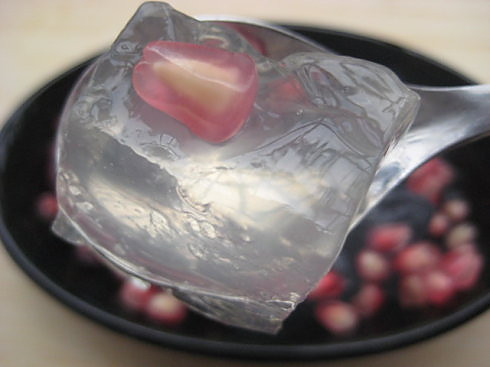 看了看包装背后的方法,我觉得太麻烦,于是就用做龟苓膏的方法来做了这盒白凉粉,没想到一样的非常成功.晶莹剔透的白凉粉在红石榴的衬托下格外美丽.