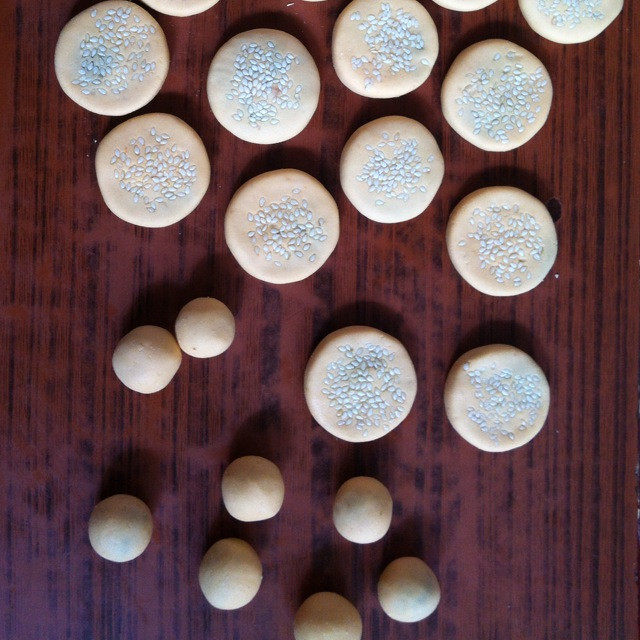 接着把面团分成多个小团子,里面包上红豆沙,表面按上些白芝麻,形状随自己喜欢。