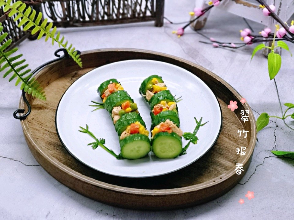 首先将黄瓜盅做好,建议最好用水果刀。 鸡胸肉丁炒好后,晾一会儿再装入黄瓜盅。 鸡胸肉切丁一定要切的小一点。