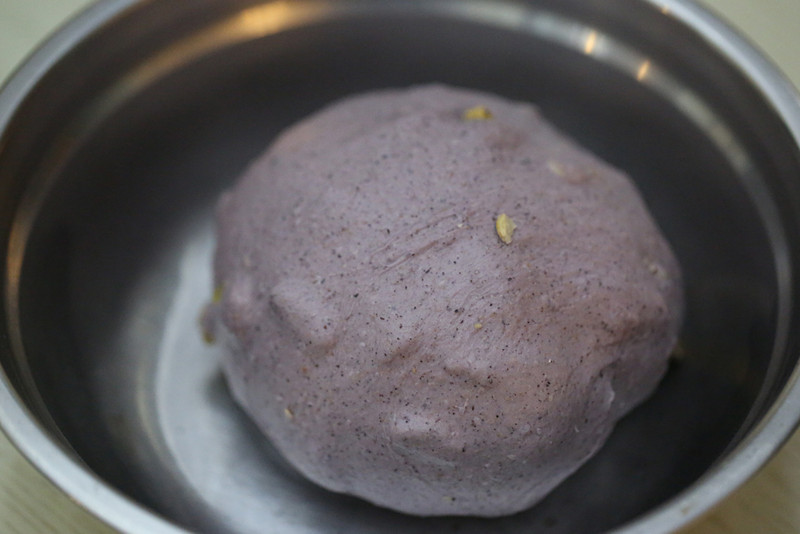 最近突然想起了那个面包,试着按自己的理解做起来,把紫米浸泡后打成浆,然后跟面粉等等其他材料揉成团,再加入了核桃和提子干。做的是软欧,发挥如常,外焦里软,唯一的缺点是,豆浆机打出的浆太粗,也没有过滤,所以口感略粗。