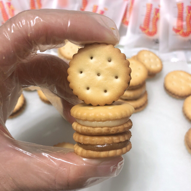8、糖挤在饼干上要记得趁热合上另一个,可以随意压出自己喜欢的厚度。