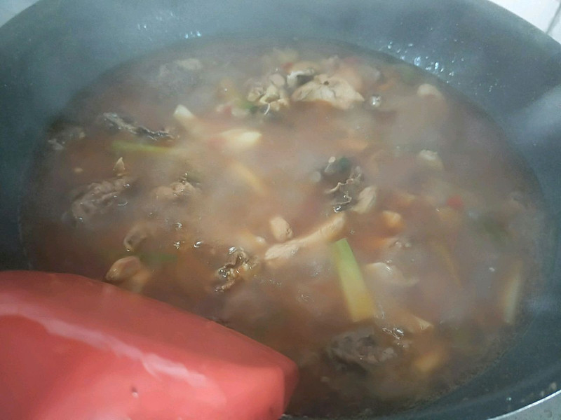 另外,这只鸡没有养很久。所以是嫩鸡,如果是老鸡的话就要多闷一段时间咯!等到鸡肉7分熟的时候加入蔬菜一起炖煮,同时起锅。