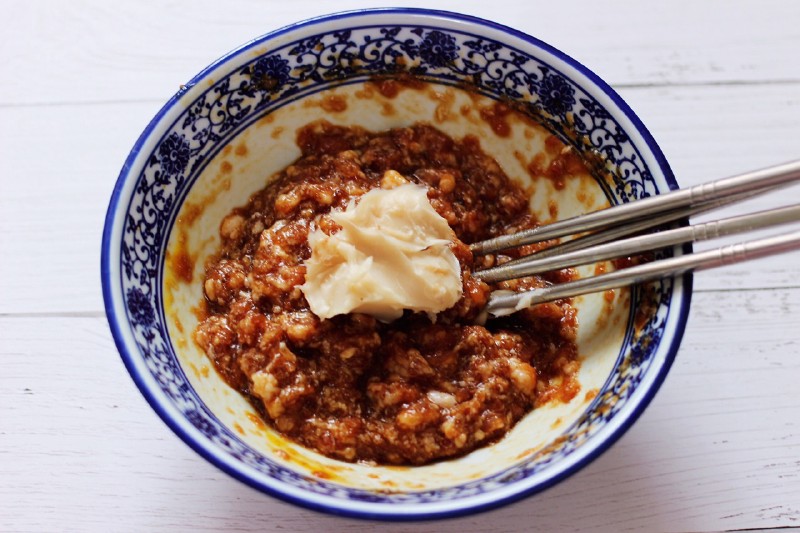 把所有的食材调料混合后顺时针方向搅拌上劲。