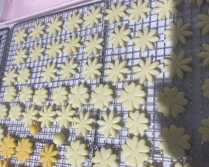 然后呢,用做翻糖的磨具,一个一个按压下去~(揉好的奶团子要快点做完,因为很容易就要变硬乐。变硬乐那真的无法救命乐……)