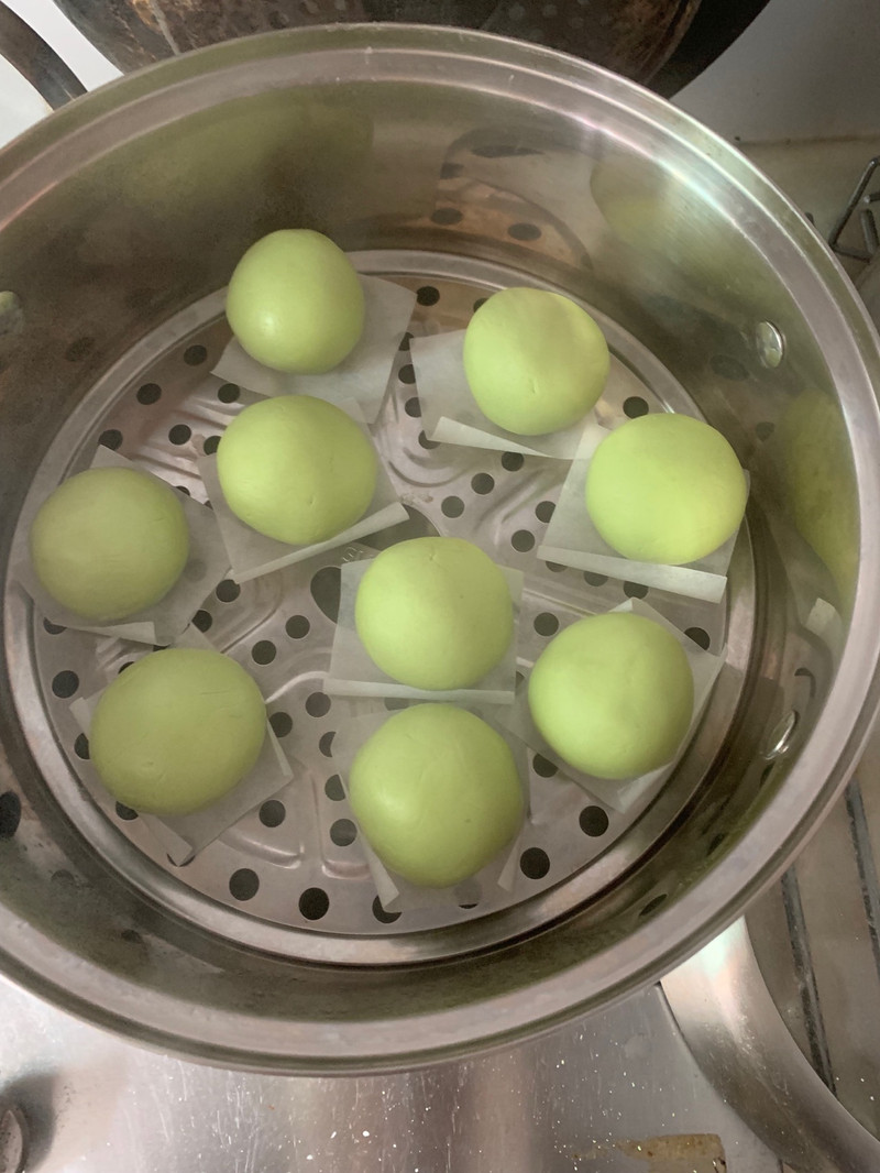 3、一定要先将水烧沸,再放青团蒸。青团不能蒸太久,一般7至8分钟就差不多好了,10分鈡足够了,蒸太久青团会塌。
