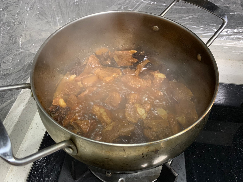 煮开后转小火,盖上锅盖焖煮,等汤汁收干大概要一小时左右,这会不能大火,要不然不入味,口感不好。