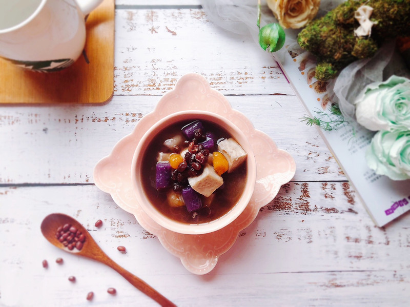 芋圆是一道著名的闽南小吃,属于福建和台湾地区的传统甜点。其由香芋、红薯、紫薯、木薯粉等材料制作而成。本食谱主要用荔浦芋头、紫薯和红薯为主要材料,红豆汤打底而成。