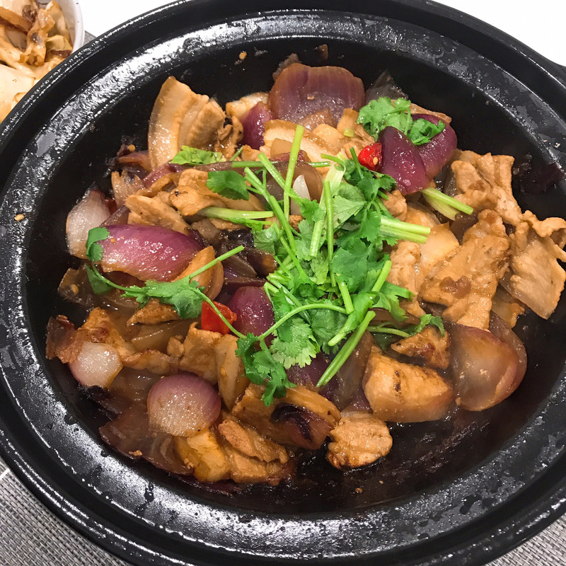 砂锅里的油一开始可以不放太多,因为炒五花肉也会有油,但是烧热砂锅的时候要把油擦的均匀一点,不然洋葱会粘住变焦。