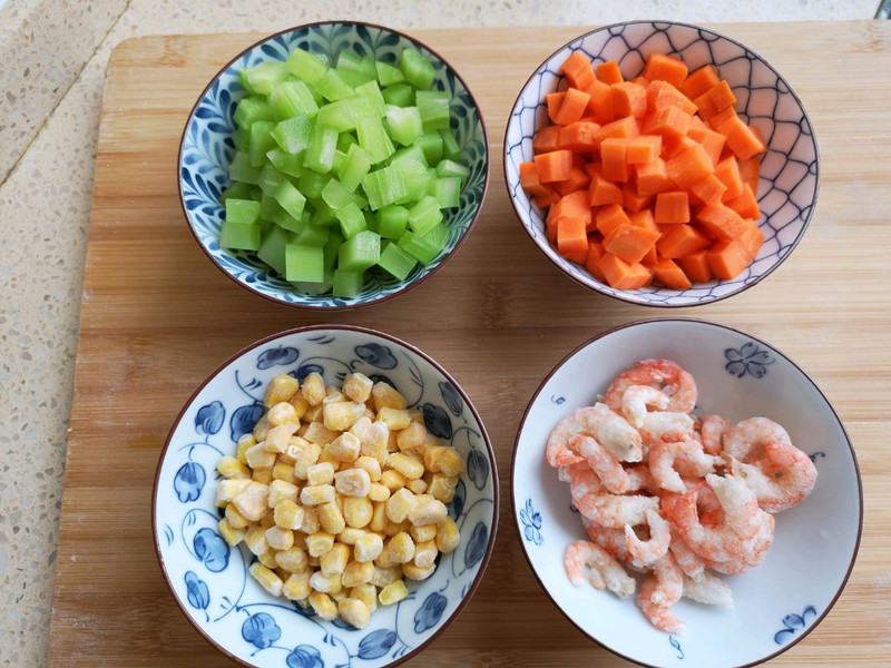 (3)鲜虾炒时蔬。胡萝卜和莴笋分别去皮后切成小丁备用,玉米粒准备小半碗,熟虾仁准备小半碗。