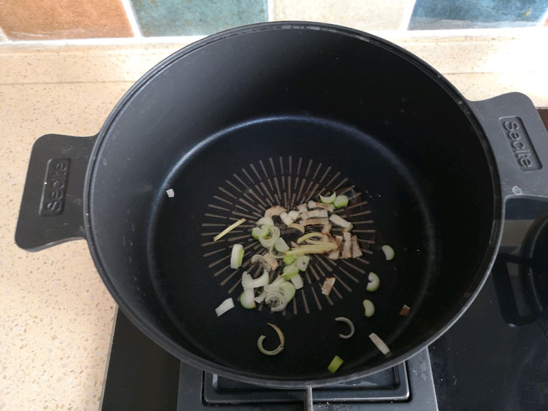 炒锅中放入适量的花生油,爆香葱段和姜丝。