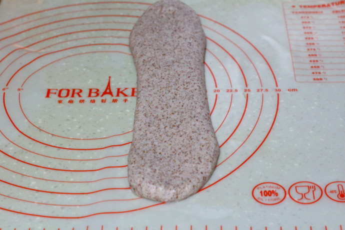 大约1小时之后面团发酵至原面团的2.5倍大小,用蘸有少许干面粉的手指在面团中间戳个洞,洞口状态不塌陷、不回缩即表示发酵完成。将发酵好的面团取出放在硅胶垫上轻拍排空里面的气体,然后平均分割成6个小面团分别滚圆,盖上保鲜膜松弛15分钟左右;黑全麦吐司的烹饪技巧