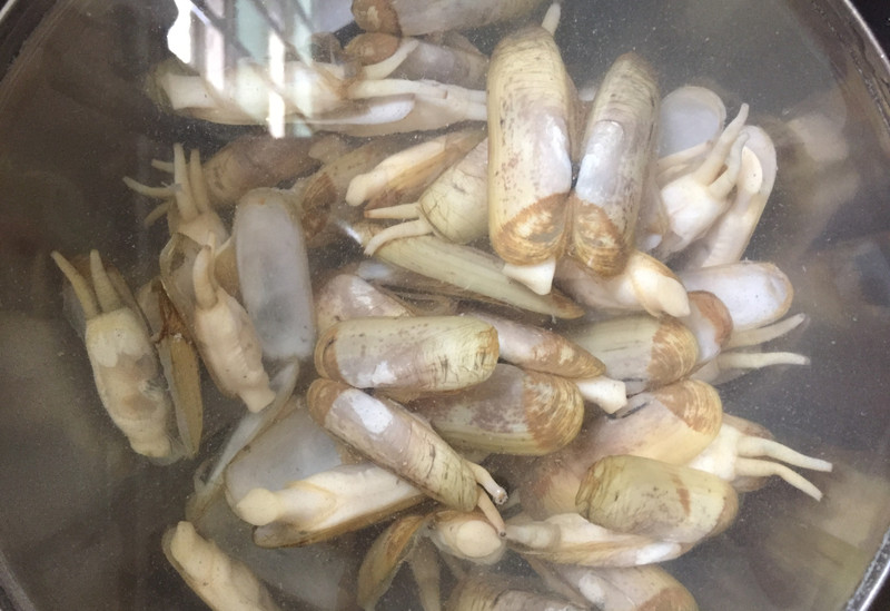 蛏子一定要吐沙干净,不然里面会有很多淤泥,加盐或者放一根不锈钢的勺子可以帮助吐沙哦。