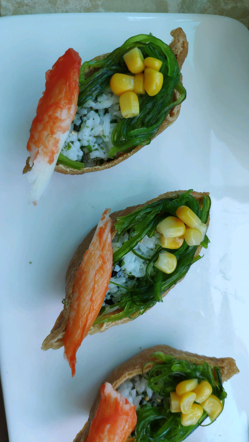 调味豆皮,有些偏甜,放上海带、鱼子酱可以综合一下口感。