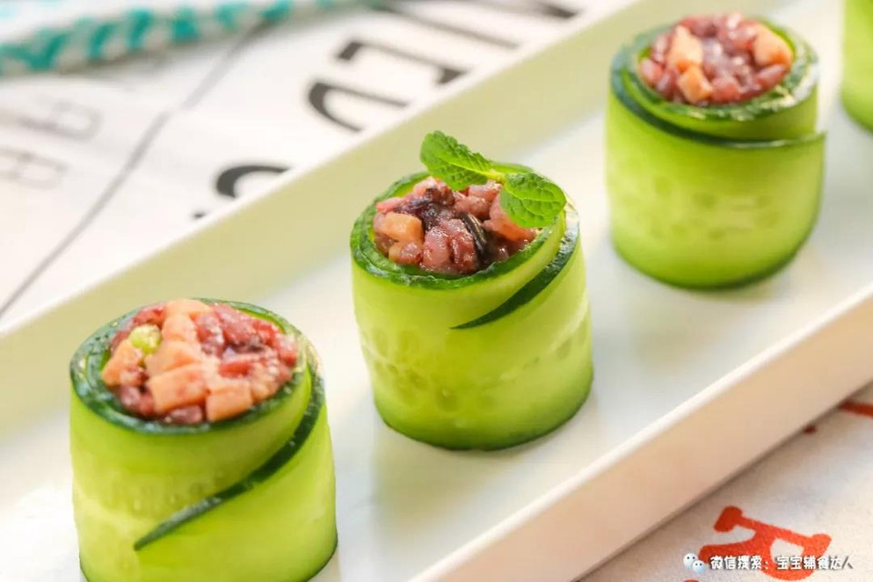 一个个黄瓜卷嫩绿脆爽,看着就要流口水了。你可以把它当成一个吃主食的好办法,或者发挥你的想象力,再加一些菜进去直接变成一餐呀!”