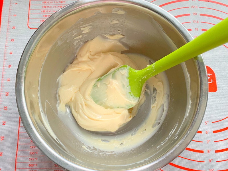 先用刮刀将糖粉拌入黄油至不见干粉,是为打发时避免糖粉蹦出来