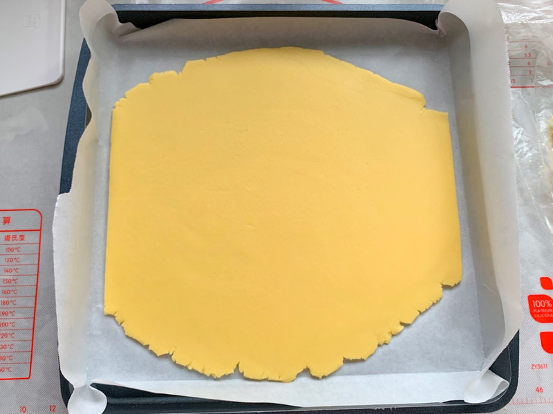 用擀面杖将面饼压成厚度均匀的面片,厚度大概是4毫米,面饼上下都铺好油纸,方便操作,面片同烤盘一起送进冰箱冷冻5到10分钟