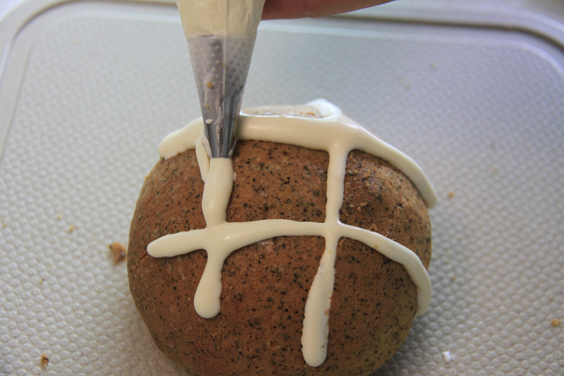 4、在挤酥皮酱时,只挤在面团顶部即可,酱在烘烤受热后会融化包裹住整个面团,一定不要挤得太多,不然融化后多余的量会全摊在烤盘上。