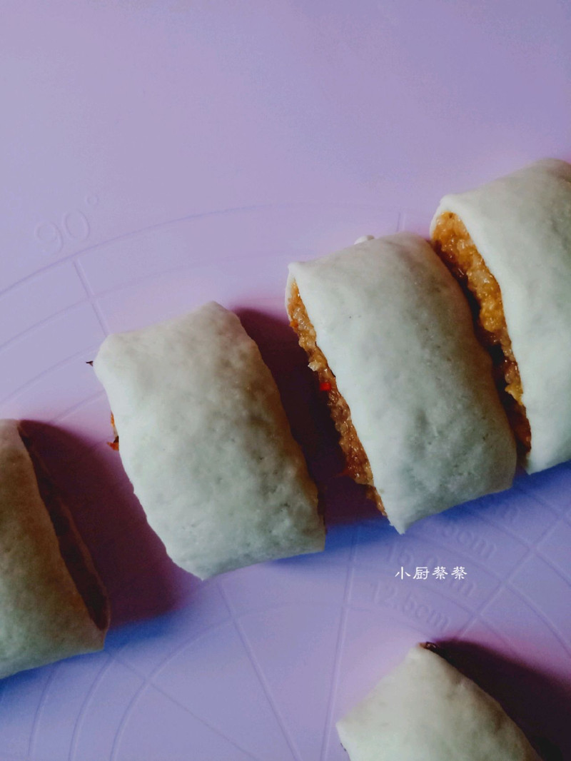 发好之后把面团的气泡揉出,然后把面团大概分为4份左右,当然了,3份5份都行,看个人操作,这个没有多大的要求。取一份擀成长度15×30左右的薄片,记得不要擀太薄,饼皮的尺寸大小可以按照自己喜欢的来,然后用刮板在金盘中切出一条炒好的糯米卷馅,直接放在擀好的饼皮上。馅料不要堆得太高太多,否则蒸的时候都会流出来。广式糯米卷的烹饪技巧