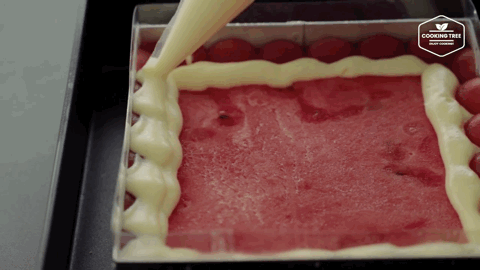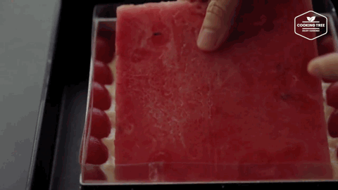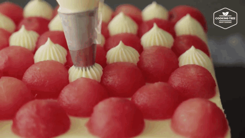 它拥有惊人的外貌,乳黄色卡仕达奶油酱与松软的抹茶蛋糕胚相互呼应 ,更厉害的是,这位蛋糕师制作了几十个西瓜果冻球布满蛋糕周围, 并且中间夹着一块真实的西瓜果肉,这样每一块都能吃到真实的西瓜果肉! 25颗西瓜肉球装点顶部,挤满奶油裱花,整个造型夸张有趣,没有任何色素调配,但是颜色好看极了!