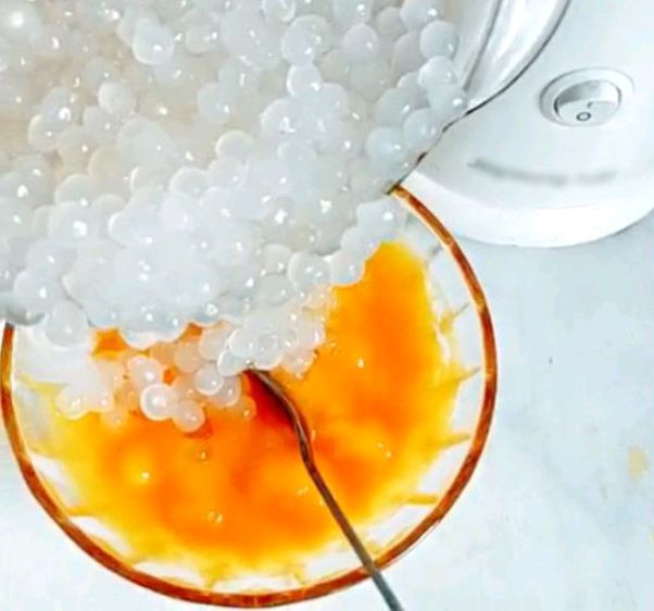 用的是小西米,水烧开后加入西米煮15分钟再闷15分钟,没有白芯,西米就煮好了。