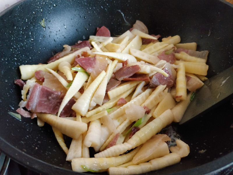 前几天我参加抽奖,运气不错,中了一袋云南宣威火腿,于是今天晚餐用它做了一盘“火腿焖笋”。