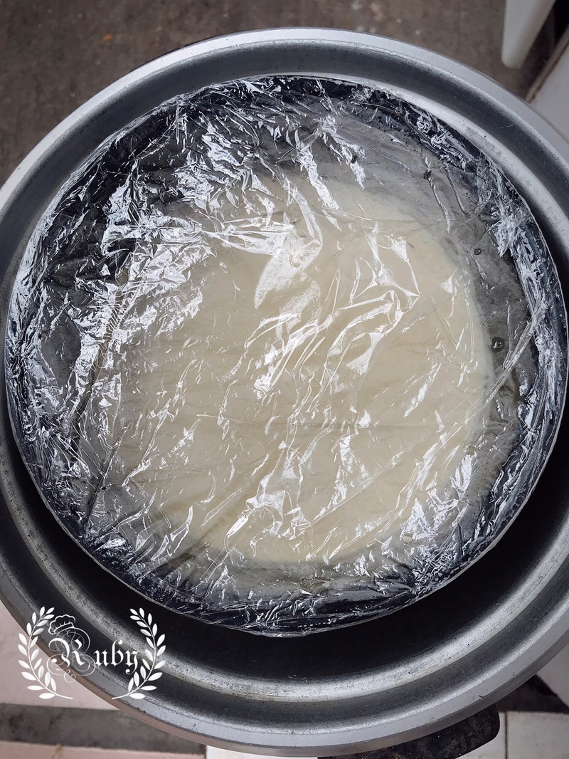 3、所以我选择了大小电饭煲内胆,小电饭煲倒入蛋糕液,有合适的带气孔的盖子就盖在小电饭煲内胆上,外层再盖大电饭煲的盖子,没有适合的小电饭煲内胆盖子就用双层保鲜膜,扎洞替代
