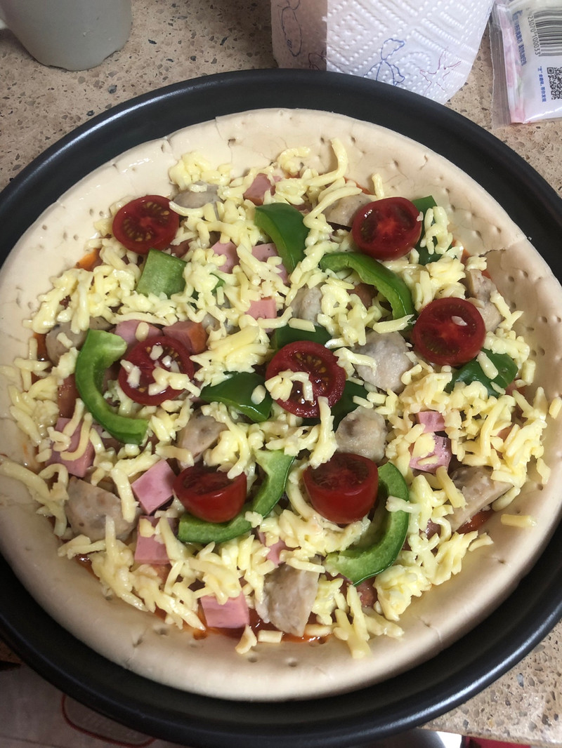 必胜客的披萨里,最爱的还是超级至尊披萨,百吃不厌,每隔一段时间就会想做一个披萨,但是前几次都不是特别成功,连奶酪丝都没拉出来,这次饼以上是成功的,饼用了现成的,不知道是薄饼本来就硬邦邦,还是哪里又出问题了,反正饼底还是硬邦邦的,不是我喜欢的面包的感觉,下次自己做个新鲜的饼底再试试。