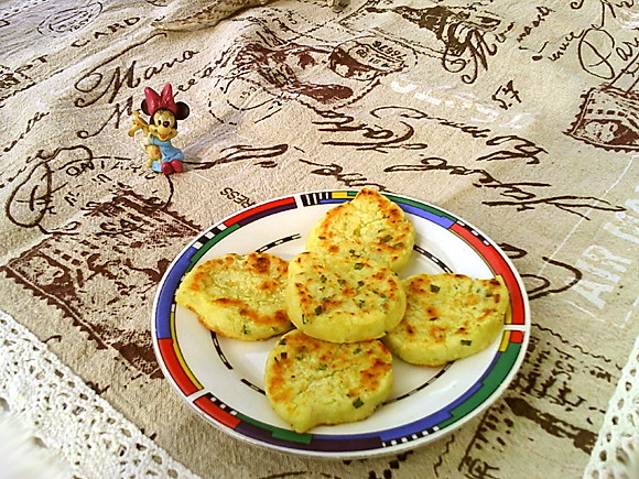 把《平底锅烤点心》的土豆叶子饼改编成葱香寿桃饼。