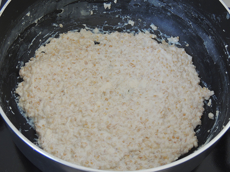 转小火将钢切燕麦煮至熟透。牛奶和燕麦煮的时候很容易噗出来,要不时的搅拌一下,避免粘锅和溢出。