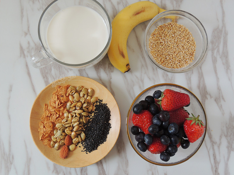 准备好所有的食材。蓝莓和草莓清洗干净,沥干水分备用。南瓜籽仁和黑芝麻都是炒熟的。
