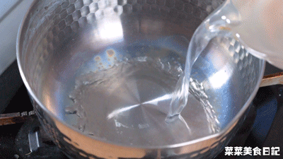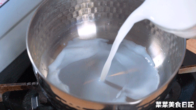 【椰子水肠粉】20g清水和20g白凉粉混合均匀,小锅里倒入180g椰子水煮至沸腾,再加入搅拌好的白凉粉煮至融化