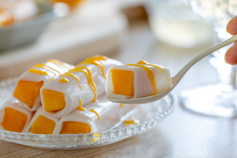 将切成片状的椰浆肠粉铺在卷帘上,卷上芒果条,再淋上芒果酱,芒果肠粉完成