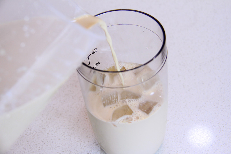 4、奶茶里面的糖浆可根据各人喜好甜度添加,最后加入适量的冰块口感会更佳,最后添加的冰块与奶茶液的比例可以是1:9或者2:8,也可以不加。