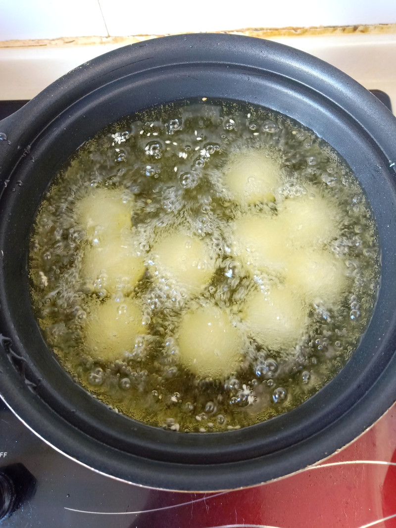2/ 油炸的过程,一定要全程小火炸。不要油温太高时炸,油温太高,火太大,表面一下成熟了,里面的无法膨胀起来,就没法空心,里面还会没熟,外面已经炸过头了。