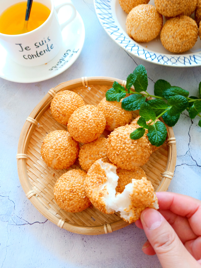 麻团,也叫麻圆、麻球、煎堆,等等。它是我们小时候吃得比较多的一种早餐,是用糯米粉加白糖和水揉制成形,再入油锅炸制而成。因其呈圆团形,表面又沾裹有芝麻,故名麻团。