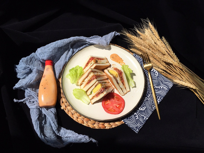 吐司片,培根,火腿片,荷包蛋,肉松,生菜,番茄,满满营养健康,配上丘比风味十足的千岛沙拉酱,完美搭配~里面有酸脆的腌黄瓜碎,相比风味更独特!
