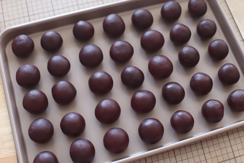 用包圆的方法,红豆沙包入蛋黄,包好收口并捏紧,备用;